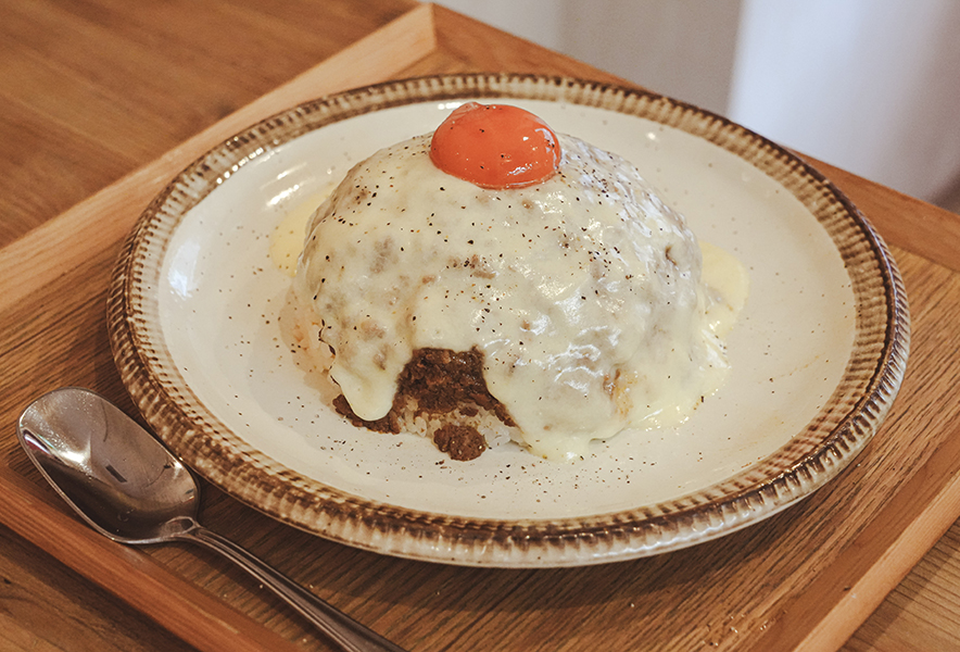 カレーをとろとろのチーズでコーティングして卵黄を載せたビジュアルが可愛らしいチーズキーマカレー