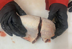 プレコが仕入れに力を入れている欧州ビーフの主な産地は、ポーランド・イギリス・アイルランドなど。牧草肥育と穀物肥育を織り交ぜたハイブリットなスタイルの肥育と、アニマルウェルフェア(※)の考えが定着する欧州ならではのストレスフリーな育成環境がもたらす、ジューシーな肉質が特徴です。そのラインナップの中で、品質とコストパフォーマンスを兼ね備えた食材として、プレコが自信を持っておすすめするのが「皮付牛タン(ポーランド産/冷凍)・グルムキブロック」です。