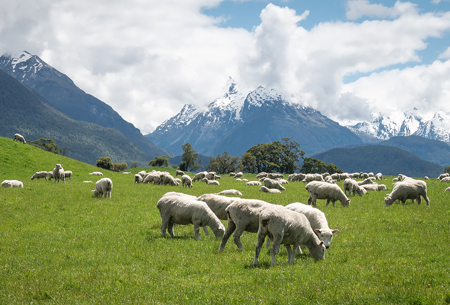 自然に恵まれたニュージーランドの放牧風景。ロムニー種という肉用種が中心。