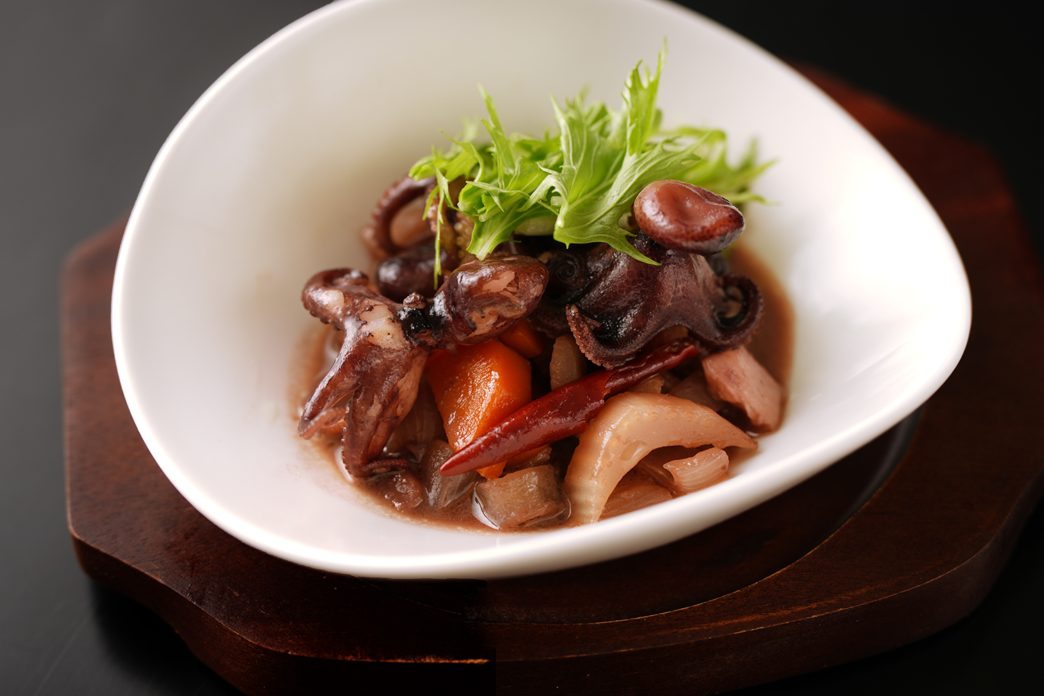 韓国料理のチュクミや、中華料理の麻辣湯のトッピングで使用される、大ブームになっている小型のタコ「イイダコ」。ぷりぷりとした弾力があり、柔らかく、加熱しても身が硬くなりにくいのが特徴です。今回はイイダコを使い、洋風と和風の“ワインに合う”一品をご紹介いたします。