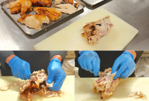 希少部位をすべて取り終わったら、ガラの骨についている小間肉をスプーンやフォークでフレーク状にほぐし、サラダや炒め物に使うことができます。取りにくい部分は手で進めましょう。