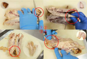 ③ヤゲン軟骨を切り落とした箇所から数センチ前方に鶏の鎖骨部分にあたる「マツバ」。骨の形がY字になっており「松の葉」に似ていることが由来とされています。