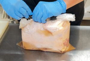 ジップロックに丸鶏とブライン液を入れたら、空気を抜いて一晩冷蔵。これで肉全体にブライン液が染み込みます。仕込みの手間は増えますが、焼成後の味の浸透度が格段に変わります。
