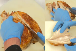 むね肉は最も火が入りやすく、乾燥しやすい部位です。ブライン液の効果でしっとり仕上がるため、冷製チキンサラダやサンドイッチ素材としても重宝します。カットの際は皮側から包丁を入れると裂けにくく、スライス断面も美しく仕上がります。むね肉の内側には鶏肉の中でも特に高タンパク質・低脂質な部位「ささみ」があり、手で簡単に割くことができます。