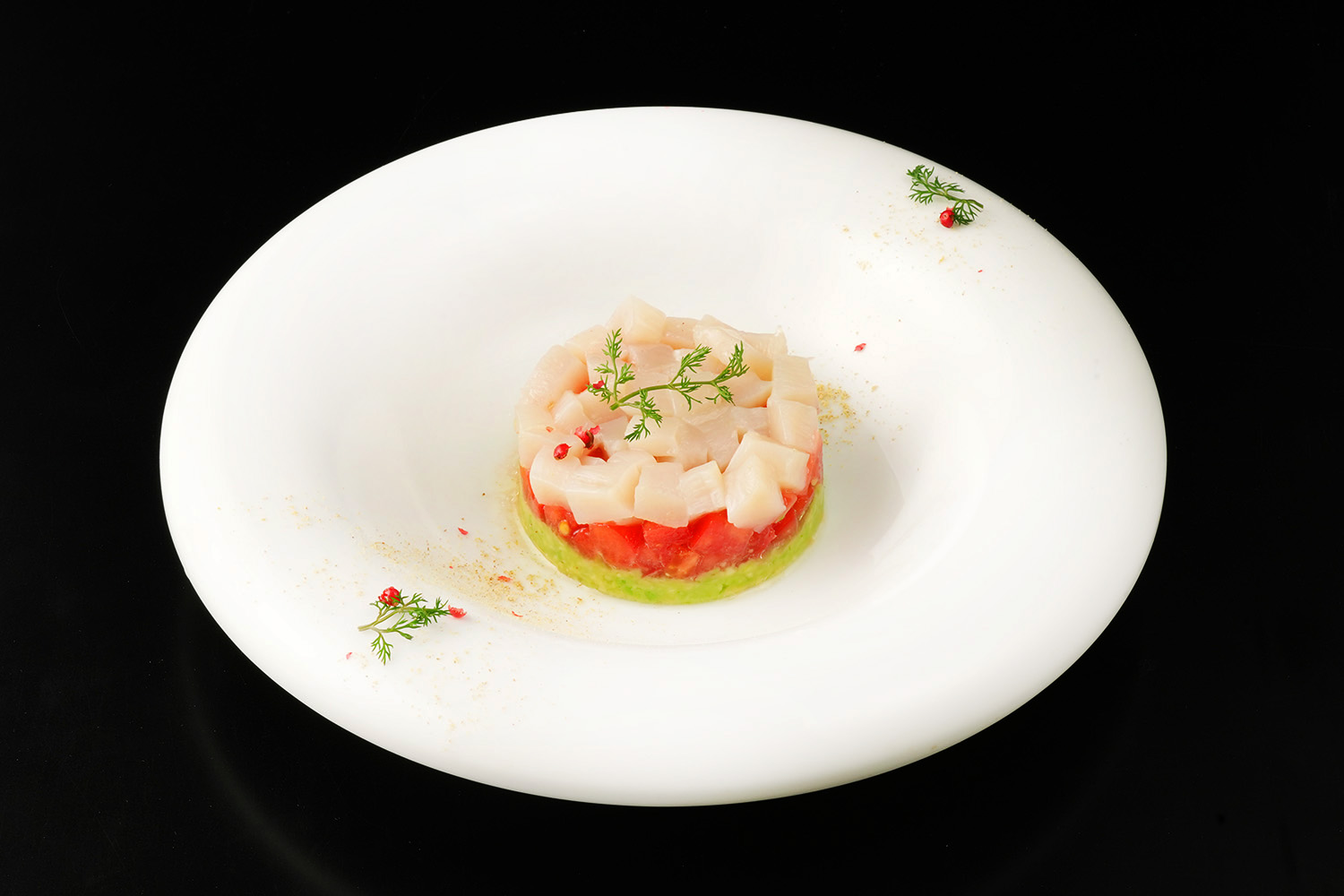 ④器にアボカドペーストを円形に伸ばし、トマト、平貝の順に盛りつけ、③をかけます。